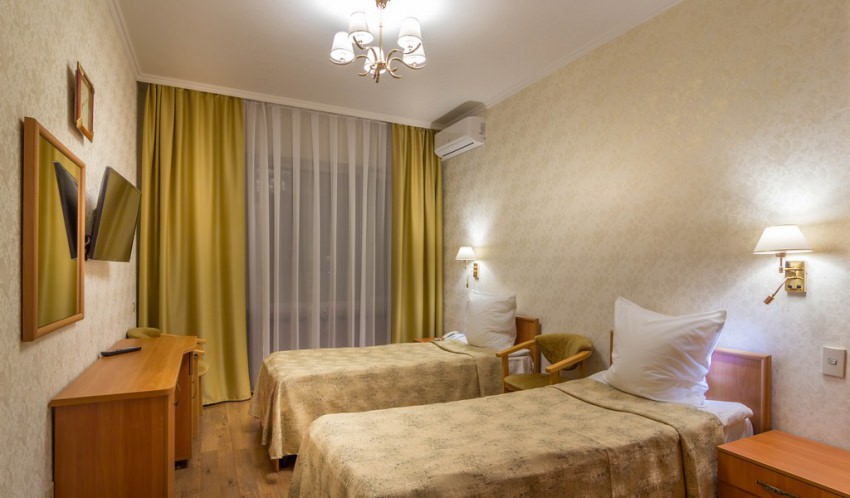 Площадь номера - 25 кв.м. 2 осн. места. 1 доп. место. Балкон. Мебель: вешалка, зеркало, кровати односпальные, прикроватные тумбочки, стол, стулья, шкаф. Оборудование: телевизор, телефон, холодильник, чайный набор посуды, электрочайник. Санузел: с ванной, туалетные принадлежности, фен. Сервис: Wi-Fi бесплатно, смена полотенец, смена постельного белья, уборка номера, услуги внутренней телефонной связи.