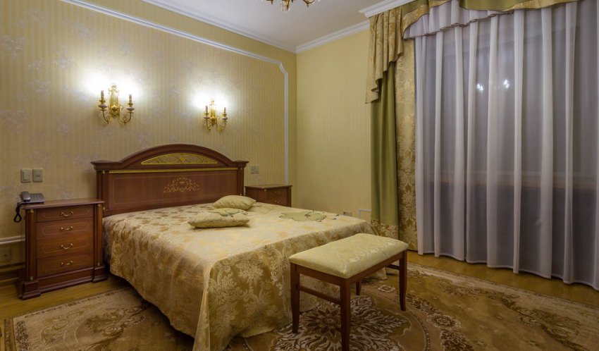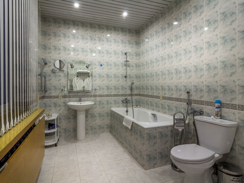Площадь номера - 77 кв.м. 2 осн. места. 1 доп. место. Мебель: вешалка, диван, зеркало, кресла, кровать двуспальная, прикроватные тумбочки, стол, стулья, шкаф. Оборудование: гладильная доска, кондиционер, телевизор (2), телефон, утюг, холодильник, чайный набор посуды, электрочайник. Санузел: биде, с душевой кабиной, туалетные принадлежности, фен. Сервис: Wi-Fi бесплатно, смена полотенец, смена постельного белья, уборка номера, услуги внутренней телефонной связи.