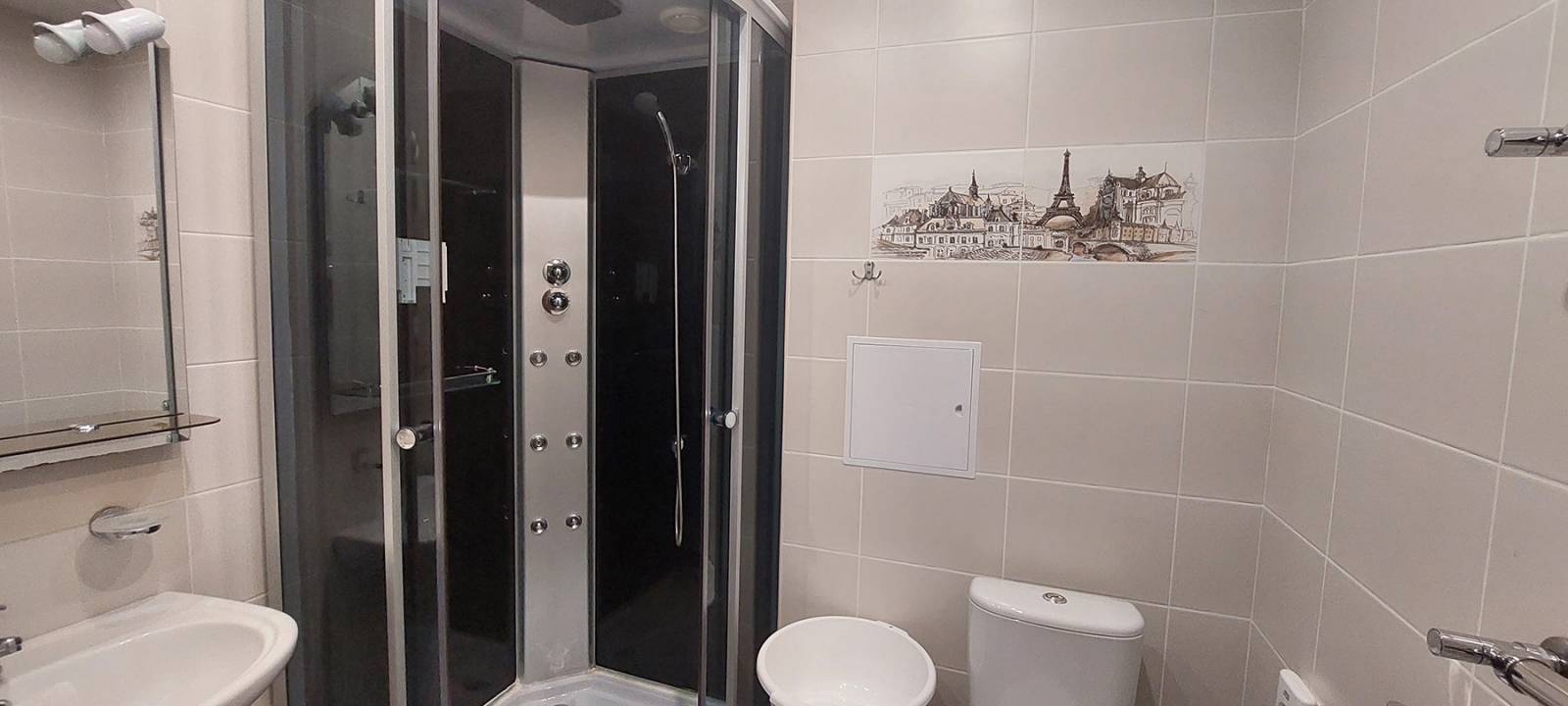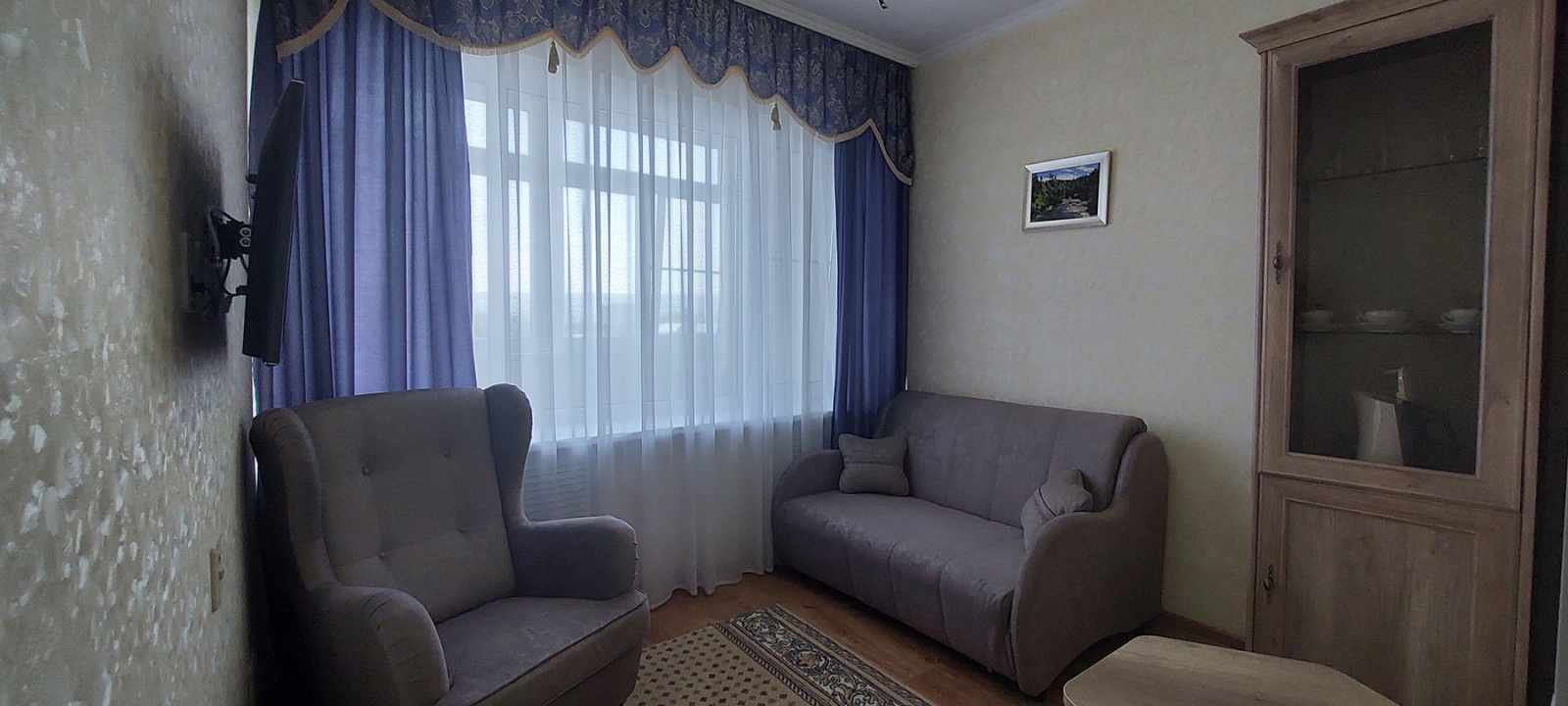 Площадь номера - 27,6 кв.м. 2 осн. места. 1 доп. место. Балкон. Мебель: диван, зеркало, кровать двуспальная, прикроватные тумбочки, столик журнальный, стулья, шкаф. Оборудование: кондиционер, сейф, телевизор (2), телефон, холодильник, чайный набор посуды, электрочайник. Санузел: с душем, туалетные принадлежности, фен. Сервис: Wi-Fi бесплатно, смена полотенец, смена постельного белья, уборка номера, услуги внутренней телефонной связи.