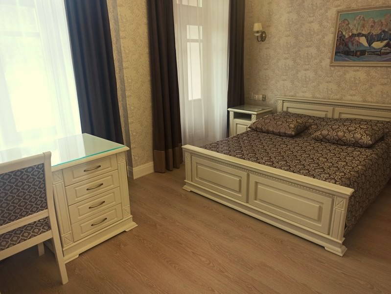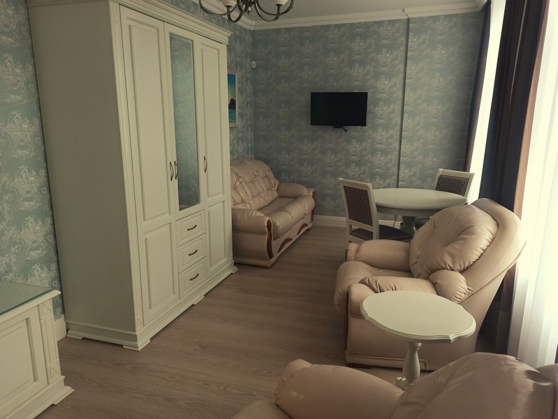 Площадь номера - 50 кв.м. 2 осн. места. 1 доп. место. Балкон. Мебель: вешалка, диван, зеркало, кресла, кровать двуспальная, прикроватные тумбочки, стол, стул. Оборудование: кондиционер, набор посуды, сейф, телевизор, телефон, холодильник, чайный набор посуды, электрочайник. Санузел: биде, с душевой кабиной, тапочки, туалетные принадлежности, фен, халат. Сервис: Wi-Fi бесплатно, смена полотенец, смена постельного белья, уборка номера, услуги внутренней телефонной связи.
