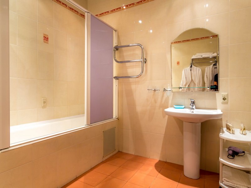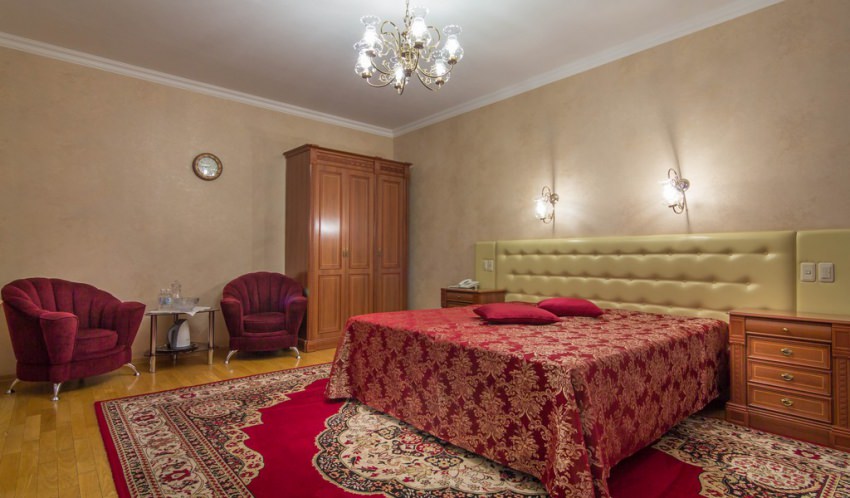 Площадь номера - 35 кв.м. 1 осн. место. 1 доп. место. Балкон. Мебель: вешалка, зеркало, кровать двуспальная, прикроватные тумбочки, стол, стулья, шкаф. Оборудование: сейф, телевизор ЖК, телефон, холодильник, чайный набор посуды, электрочайник. Санузел: с ванной, туалетные принадлежности, фен. Сервис: Wi-Fi бесплатно, смена полотенец, смена постельного белья, уборка номера, услуги внутренней телефонной связи.